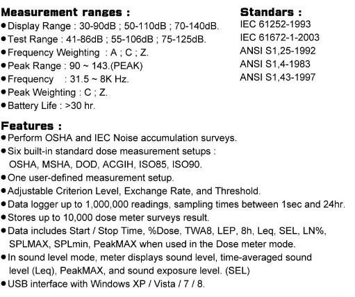 - Test Range : 41-86dB, 55-106dB and 75-125dB.